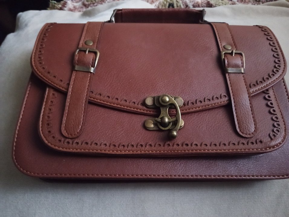 Parlak kahverengi deri, tokalı kapama ve vintage bohem tarzıyla günlük kullanıma uygun kadın çantası.
