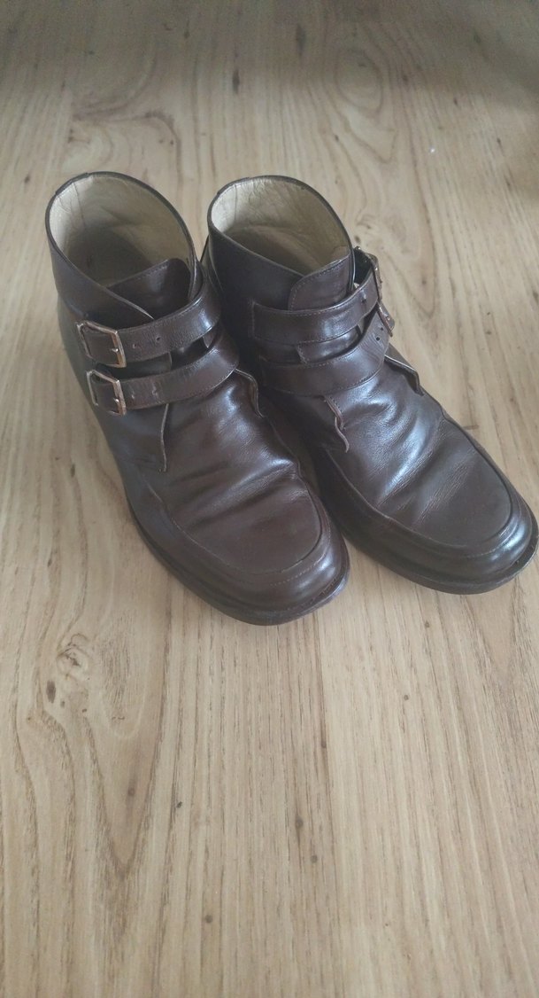 Çift tokalı koyu kahverengi deri erkek botu, klasik ve desensiz tasarımla günlük kullanıma uygundur.