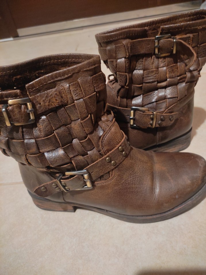 Kahverengi deri, tokalı ve blok topuklu dokuma detayına sahip. Günlük kullanım için uygun, sokak stili havasında.
