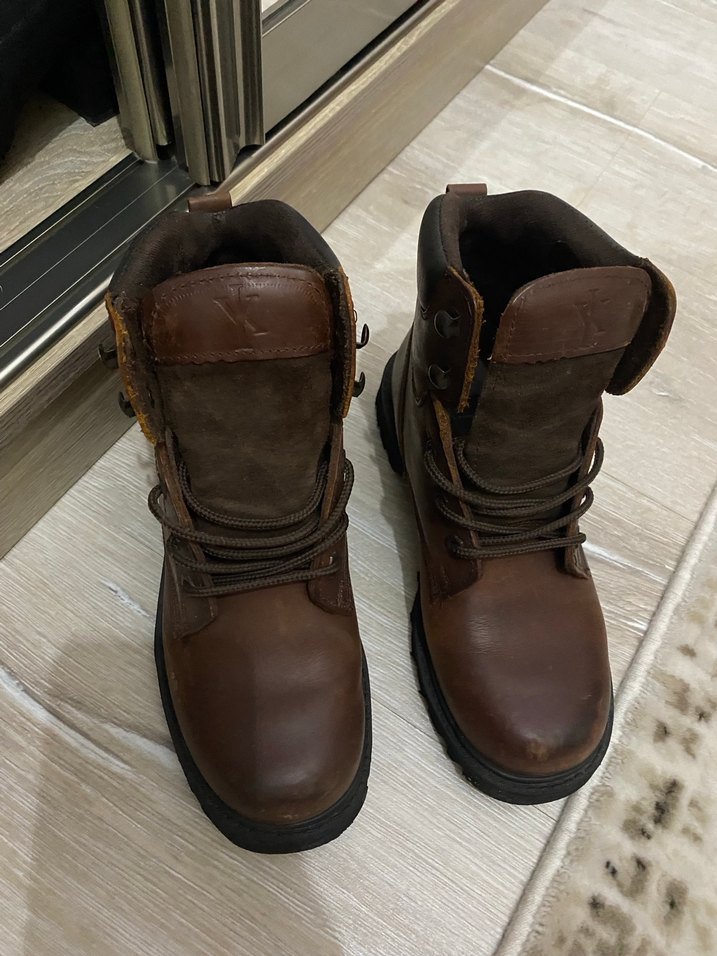 için koyu kahverengi deriden yapılmış, tokalı detaylara sahip botlar. Rahat ve günlük sokak stiline uygun tasarım.