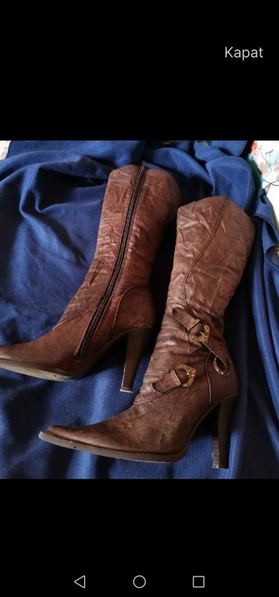 Kahverengi deri, tokalı, yüksek topuklu diz boyu çizme. Vintage bohem tarzıyla günlük kullanıma uygundur. Gerçek deri çok farklı tarzı olan bir ürün.