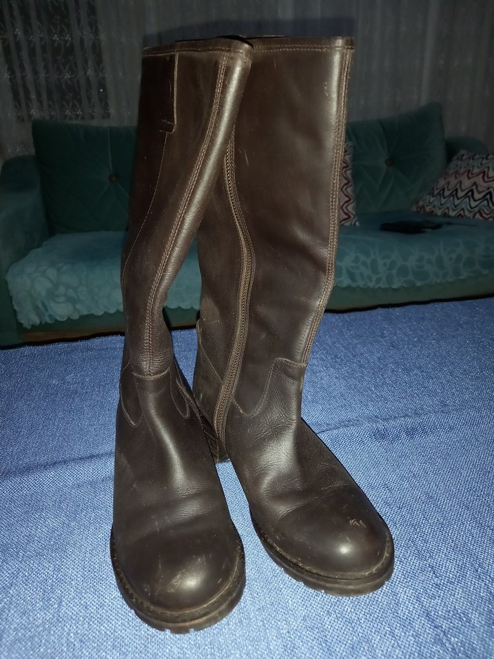 Koyu kahverengi deri, tokalı ve stiletto topuklu dizüstü biker tarzı çizme, günlük kullanıma uygun. hakiki Deri