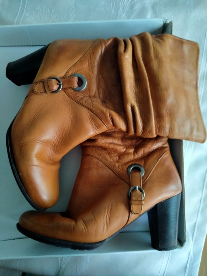 Kahverengi deri botlar, parlak yüzeyli, tokalı ve kalın topuklu. Düz ve desensiz, biker tarzında.
