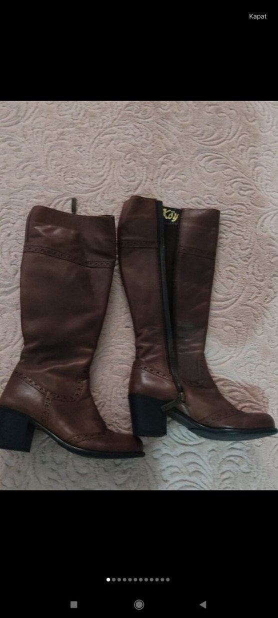 Kahverengi deri dizüstü çizme, kalın topuk ve tokalı detaylarıyla vintage bohem tarzını yansıtır. Günlük kullanıma uygundur. deri cizme 36 nunara hediye geldi sayili giyilmis sorunsuz gercek deri