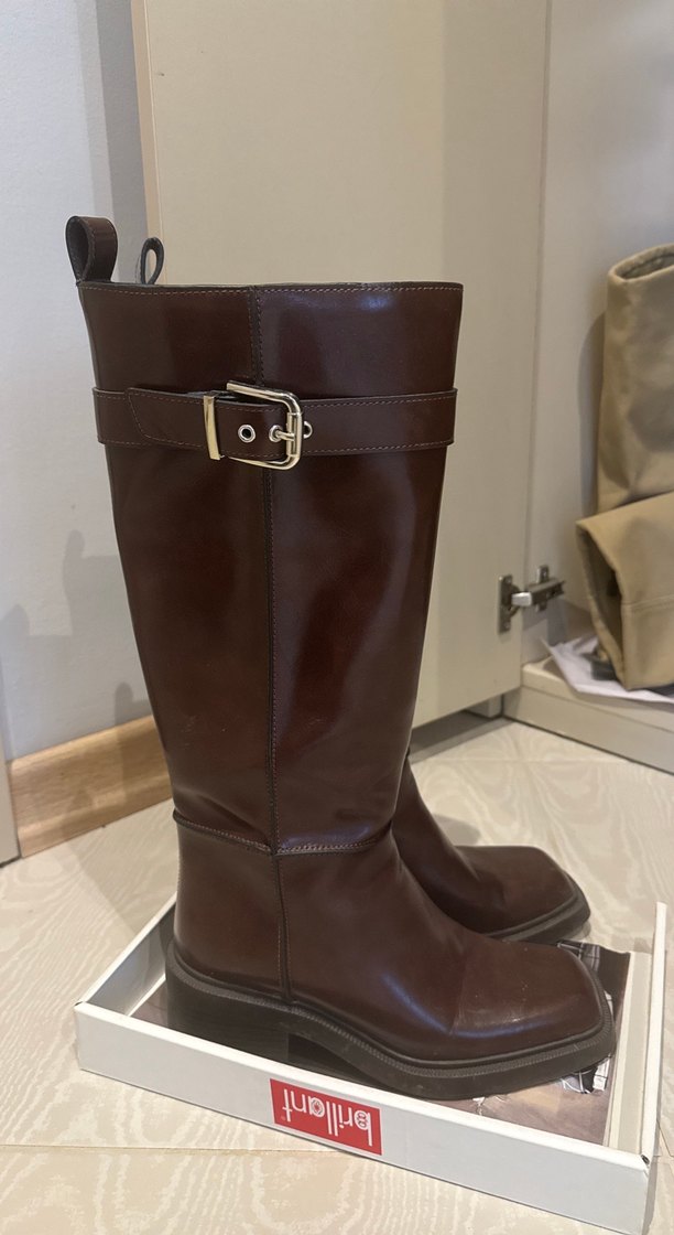 Koyu kahverengi deri dizüstü çizme, yüksek topuklu ve tokalı, günlük sokak stili için uygun. 1 kere giyildi yeni sezon