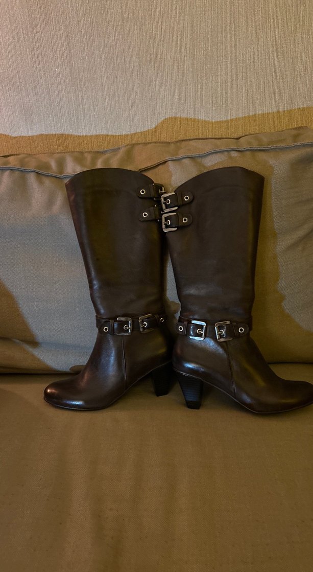 Kahverengi deri dizüstü çizme, yüksek topuklu ve tokalı kayışlara sahip. Klasik gotik tarzda, düz yüzeyli ve günlük kullanıma uygun.