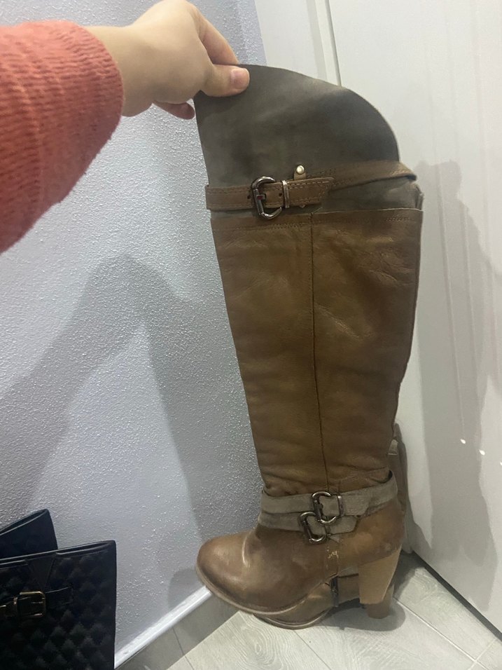 Kahverengi Deri Tokalı Dizüstü Kadın Çizmesi