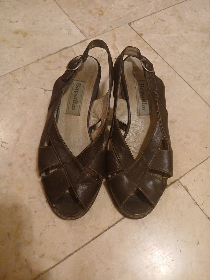 Kahverengi deri tokalı dolgu topuklu sandaletler, parlak yüzeyli ve günlük kullanıma uygun sade, vintage tarzda.