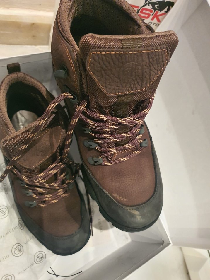 Koyu kahverengi deri erkek botları, tokalı kayışlar ve sağlam bağcıklarla dış mekan kullanımı için uygun, rahat biker tarzında.