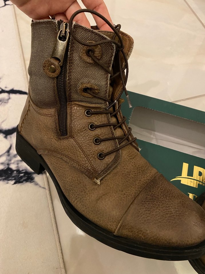 Kahverengi deri, tokalı ve fermuarlı, bağcıklı erkek botu. Sokak stili ve günlük kullanım için uygun, dayanıklı görünüme sahip. Tertemiz duruyor