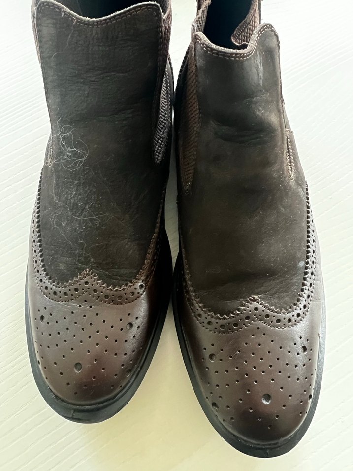 Koyu kahverengi deri erkek bot, topukta tokalı ve burun kısmında delikli klasik ve sade tasarım.