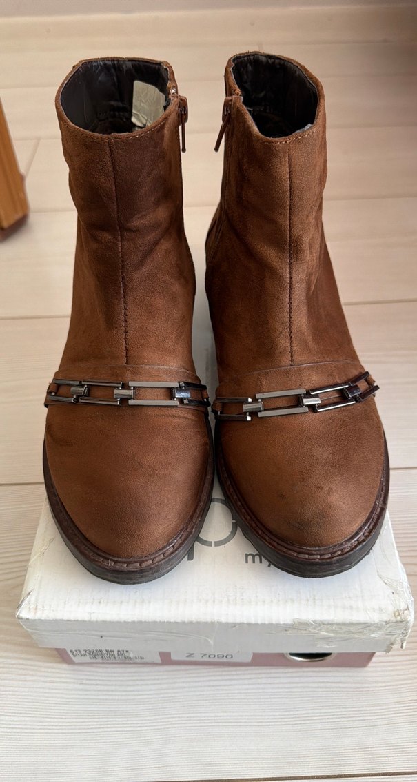 Kahverengi deri kadın botları, tokalı ve blok topuklu, parlak yüzeyli ve minimalist tasarımlı, trend günlük kullanım için uygundur.