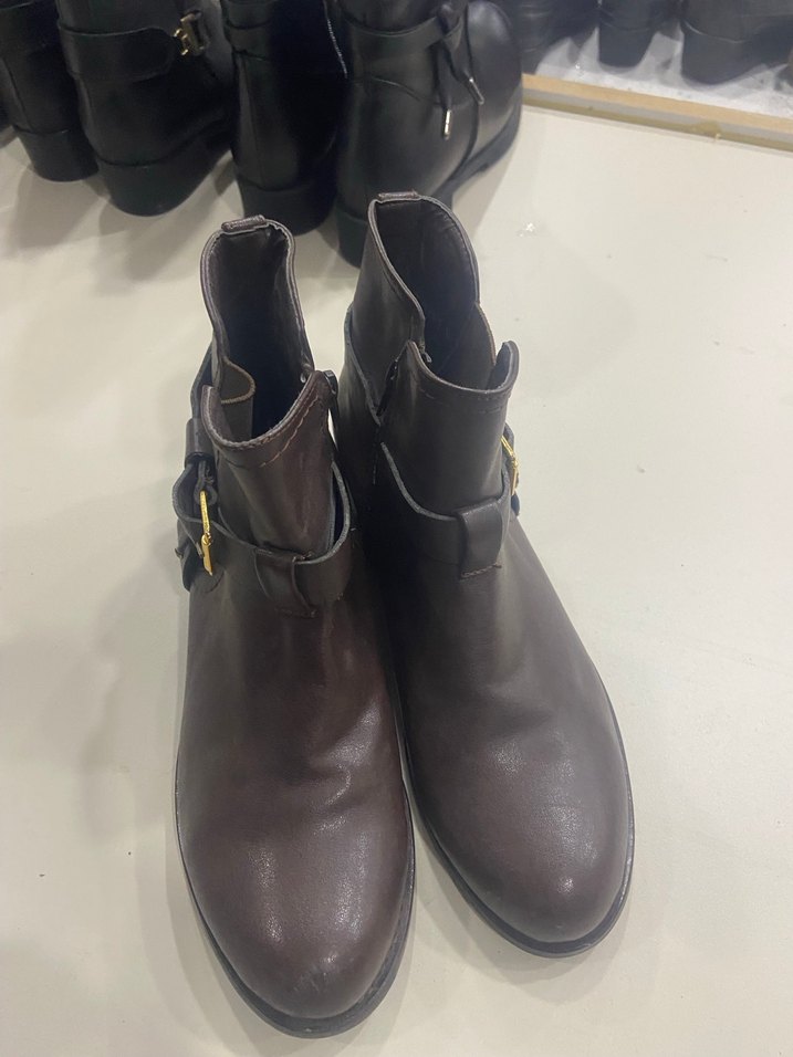 Koyu kahverengi deri, tokalı ve kalın topuklu kadın botu, günlük şık kullanıma uygundur.