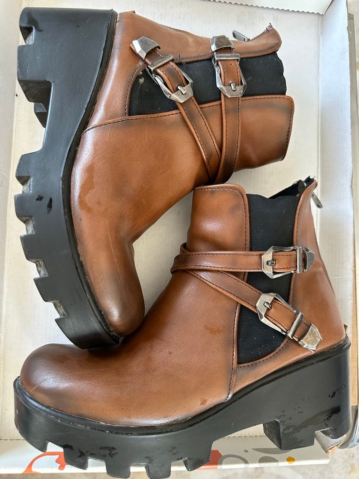 Kahverengi deri, tokalı bantlı, dolgu topuklu, kalın tabanlı kadın biker botu. Günlük kullanıma uygun şık tasarım.