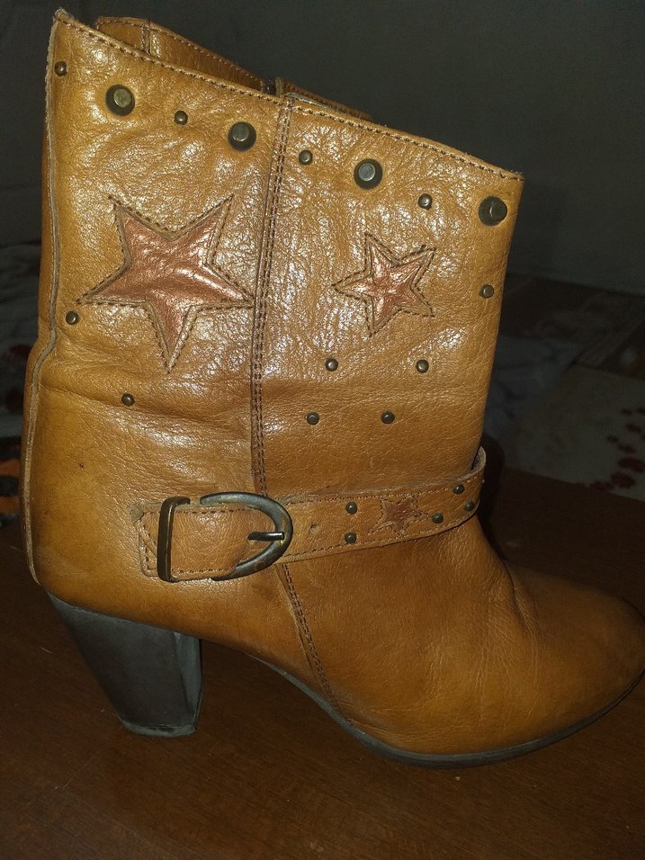 Kahverengi deri, yüksek topuklu kadın botları tokalı ve yıldız detaylıdır. Parlak yüzeyiyle vintage bohem tarzını yansıtır. Günlük kullanım için uygundur.