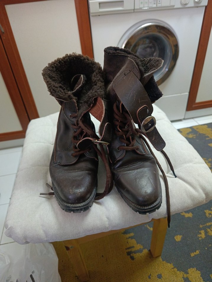 Kahverengi deri, yüksek topuklu ve tokalı kadın botları, vintage tarzda ve yumuşak iç astarlı. Günlük kullanım için uygun.
