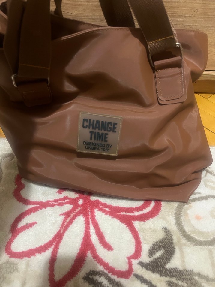 Parlak kahverengi deri tokalı kadın çanta, üzerinde "CHANGE TIME" yazılı baskılı bir etiket bulunur. Sokak stiline uygun gündelik şıklık sunar.