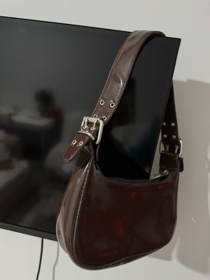 Kahverengi deri tokalı askıya sahip, klasik Paris tarzı gotik stil kadın çantası. Desensiz ve günlük kullanıma uygun.