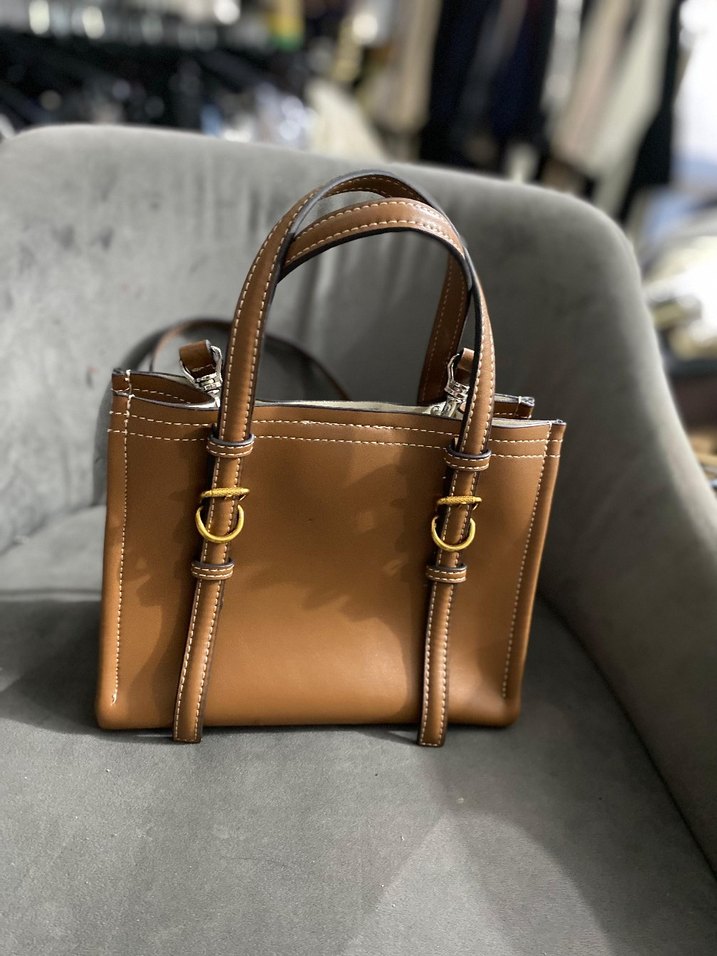 Kahverengi deri, parlak yüzeyli tokalı askılara sahip bu kadın çantası, günlük kullanım için çağdaş ve klasik Paris tarzını yansıtıyor.