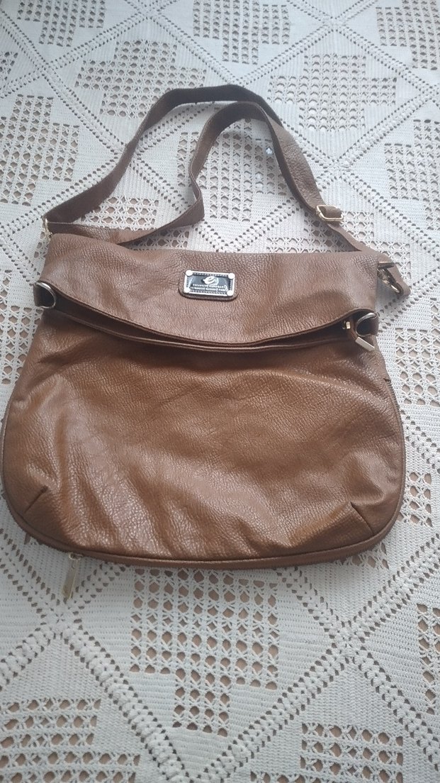 Parlak kahverengi deri, tokalı kapaklı kadın çantası. Günlük kullanıma uygun bohem tarzda, desen içermeyen retro Paris esintili model. alttan genişletme imkanı fermuarlı yeni bir kaç kez kullanıldı