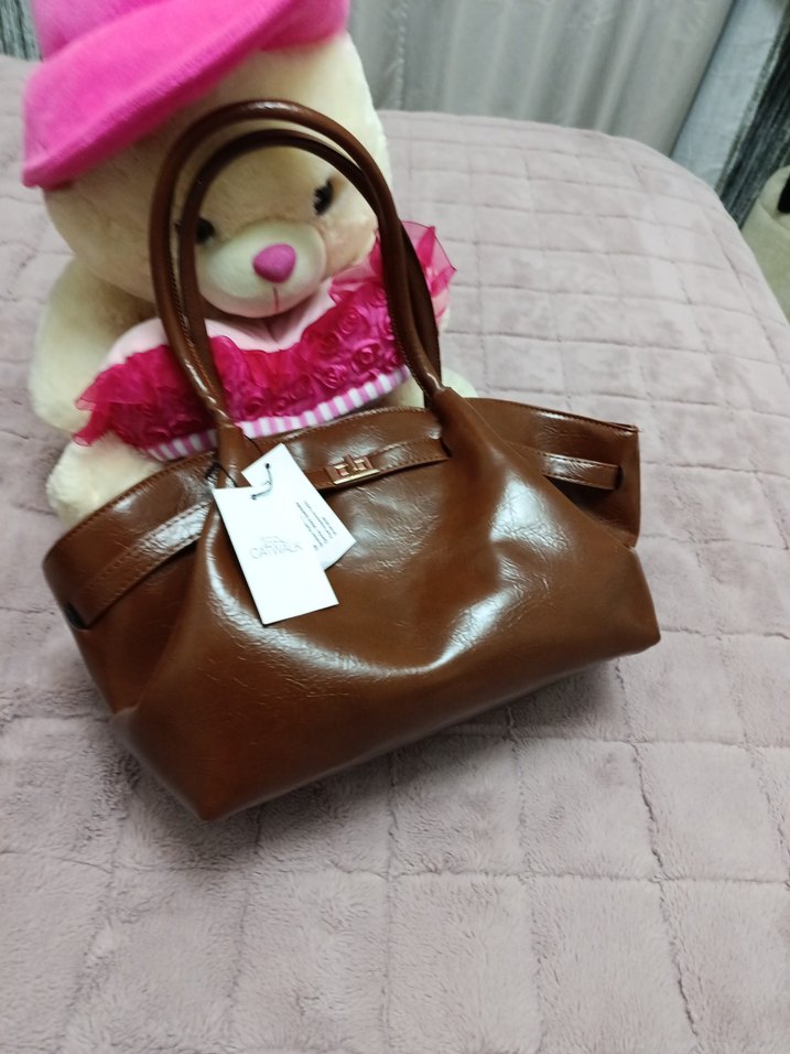Parlak kahverengi deriden yapılmış, tokalı detaylı kadın çanta. Günlük kullanıma uygun, çağdaş ve klasik Paris tarzı.