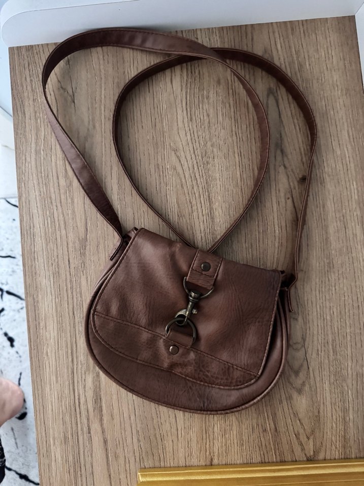 Kahverengi deri tokalı kadın çanta, minimalist bohem tarzda, günlük kullanıma uygun. Düz yüzeyli ve uzun askılıdır.