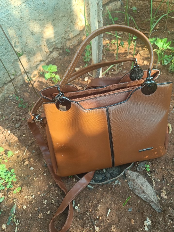 Kahverengi deri, tokalı, parlak yüzeyli kadın çanta. Minimalist, bohem tarzda, günlük kullanıma uygun şık ve rahat.