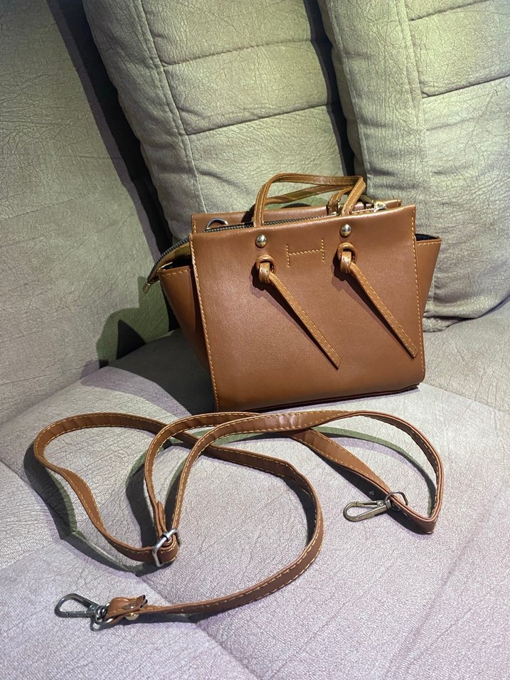 Kahverengi deri, tokalı askıları ve minimalist tasarımıyla kadın çantasıdır. Çıkarılabilir omuz askısı ile farklı taşıma seçenekleri sunar.