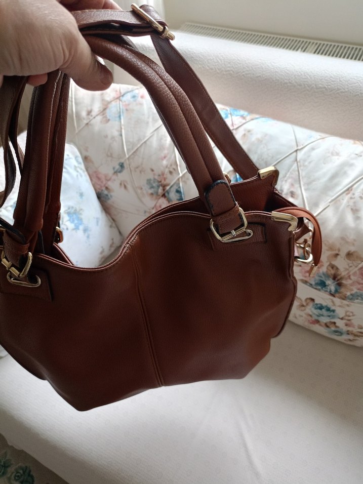Kahverengi deri, tokalı saplara sahip bohem tarzda kadın çanta. Düz yüzeyli, günlük kullanıma uygun. fazla kullanılnadı