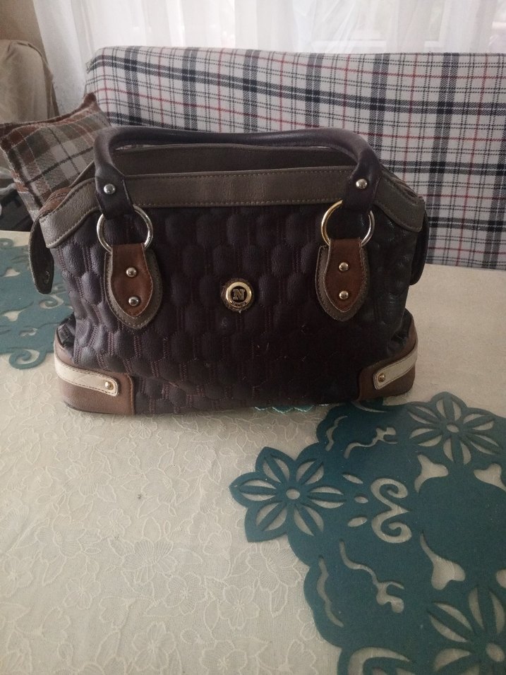 Kahverengi deri, tokalı kayışlara sahip kadın çantası, modern klasik tasarımla günlük kullanıma uygundur.