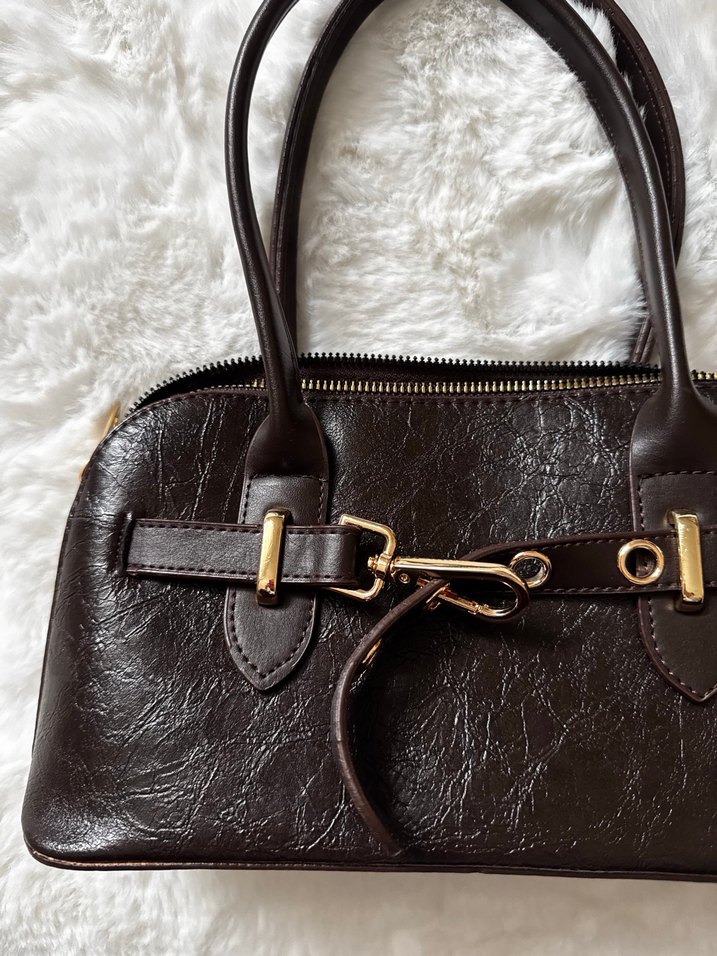 Kahverengi deri, parlak yüzeye sahip, tokalı kadın çantası, günlük kullanım için modern klasik tarzda.