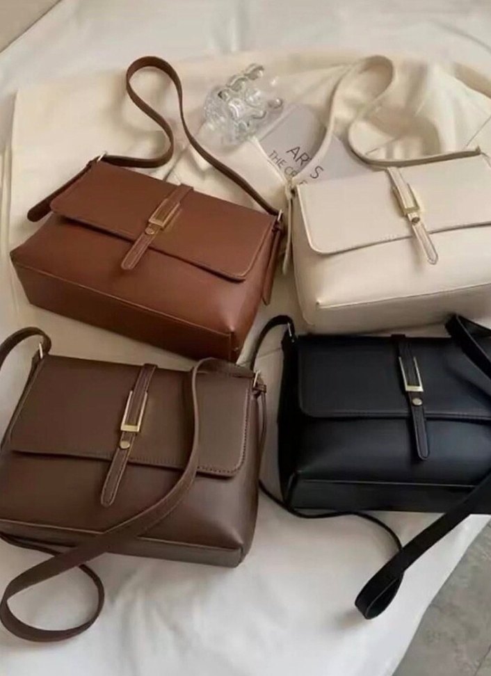 Kahverengi deri kadın çanta, tokalı kayış ve minimalist modern klasik tasarıma sahiptir. Günlük kullanıma uygun, klasik zarafet sunar.