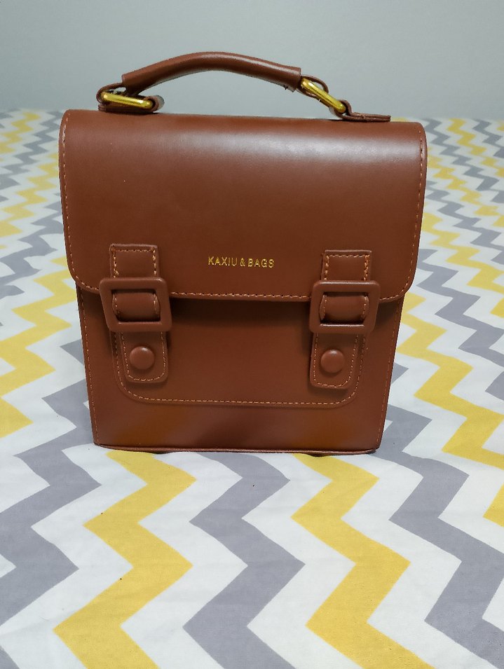 Kahverengi deri, tokalı ve elde taşınabilen kadın çantası. Modern klasik tarzda, üzerinde KAXIUEBAGS baskısı bulunur.