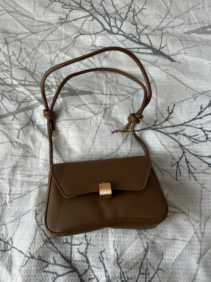 Kahverengi deri, tokalı kapaklı ve minimalist tasarımlı bu çanta, klasik ve günlük şıklık için uygundur.