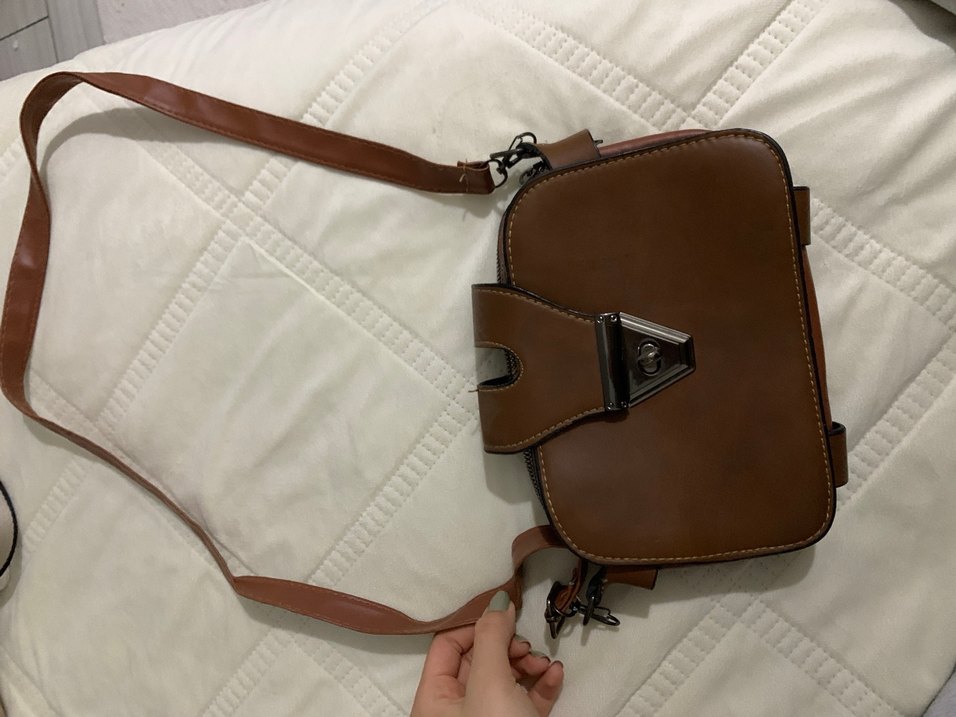 Kahverengi deri tokalı kadın çanta, düz yüzeyi ve bohem-retro tarzıyla günlük kullanıma uygundur.