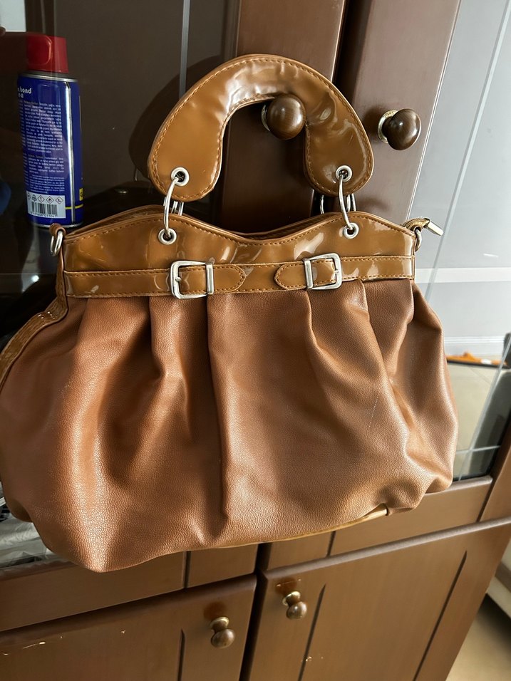 Kahverengi deri, parlak yüzeyli tokalı kadın çantası. Yumuşak dokulu ve günlük kullanıma uygun bohem tarzda.