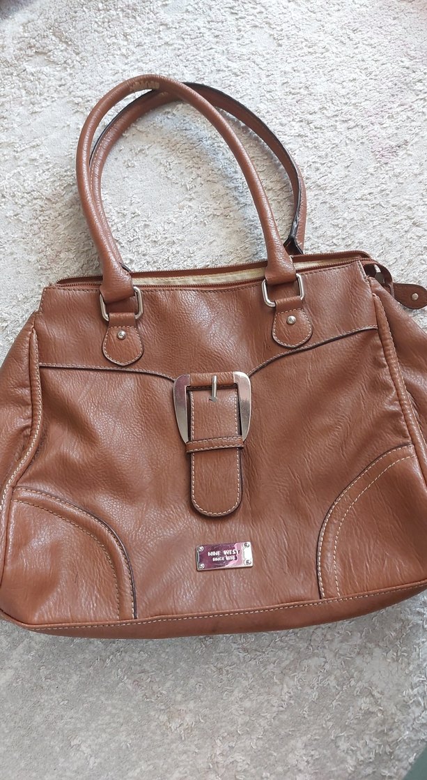Kahverengi deri kadın çanta, tokalı ön detay ve çift saplıdır. Parlak yüzeyi ve klasik, desensiz tasarımıyla trend sokak stiline uygundur. Nine West Orijinal ürünüdür.