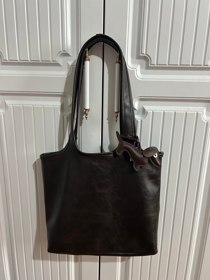 Kahverengi deri tokalı kadın çantası, koyu ve desensiz tasarıma sahip. Gotik stil ve klasik Paris şıklığı yansıtıyor, günlük kullanıma uygun.
