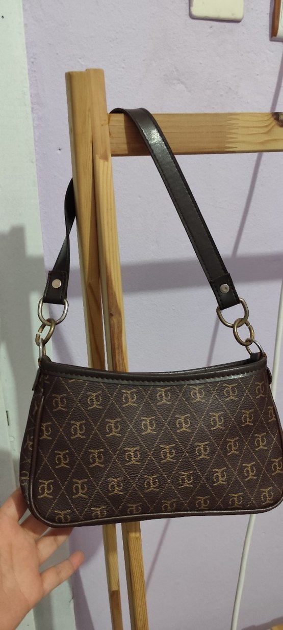 Kahverengi deri tokalı askıya ve baskılı desene sahip bu kadın çantası günlük kullanıma uygundur yeni alıcısına hayırlı olsun