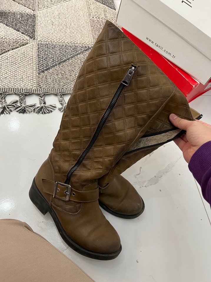 Kahverengi Deri Tokalı Kadın Dizüstü Bot