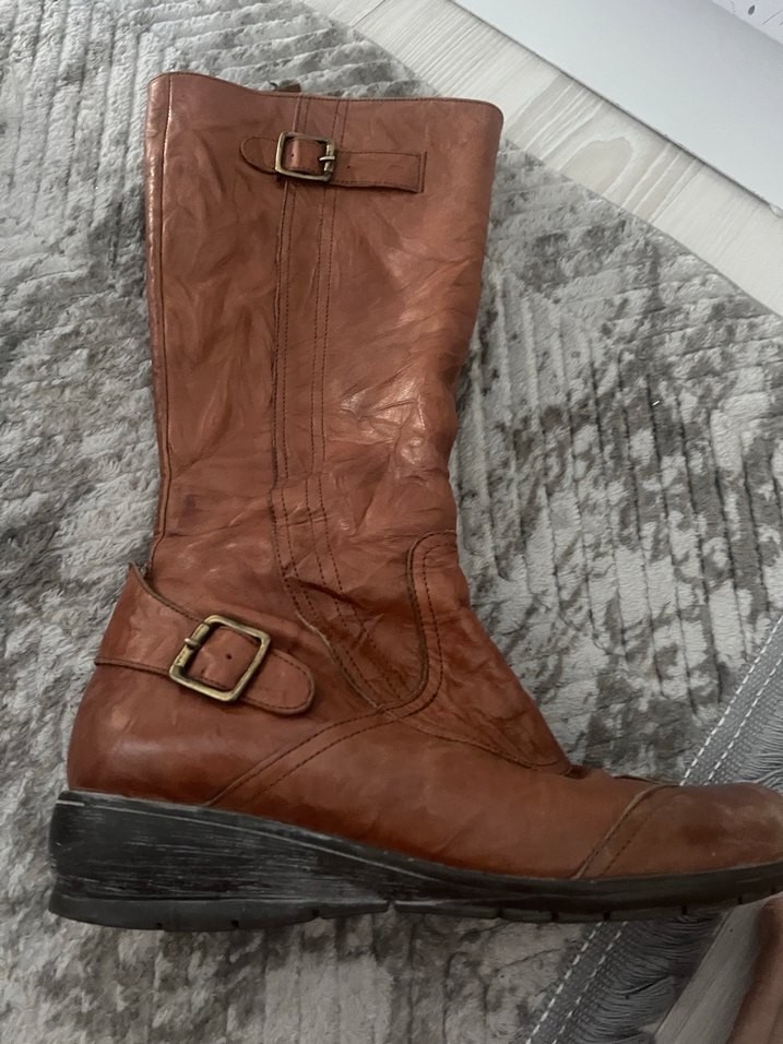 Kahverengi deri, tokalı kayışlı ve kama topuklu dizüstü kadın çizmesi, sade ve rahat bohem tarzında.