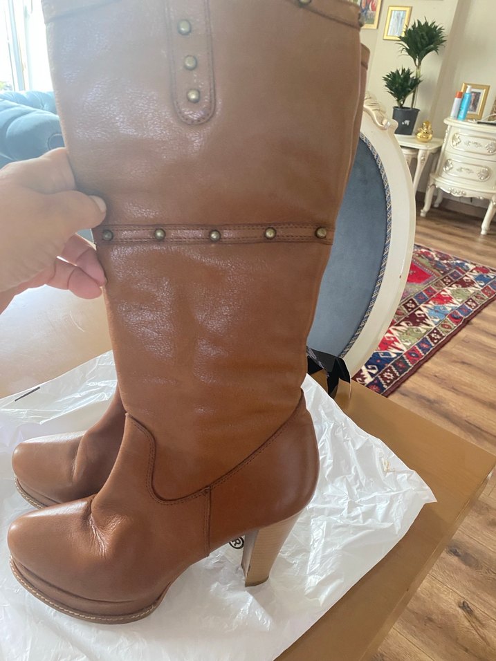 Kahverengi Deri Tokalı Kadın Dizüstü Çizme