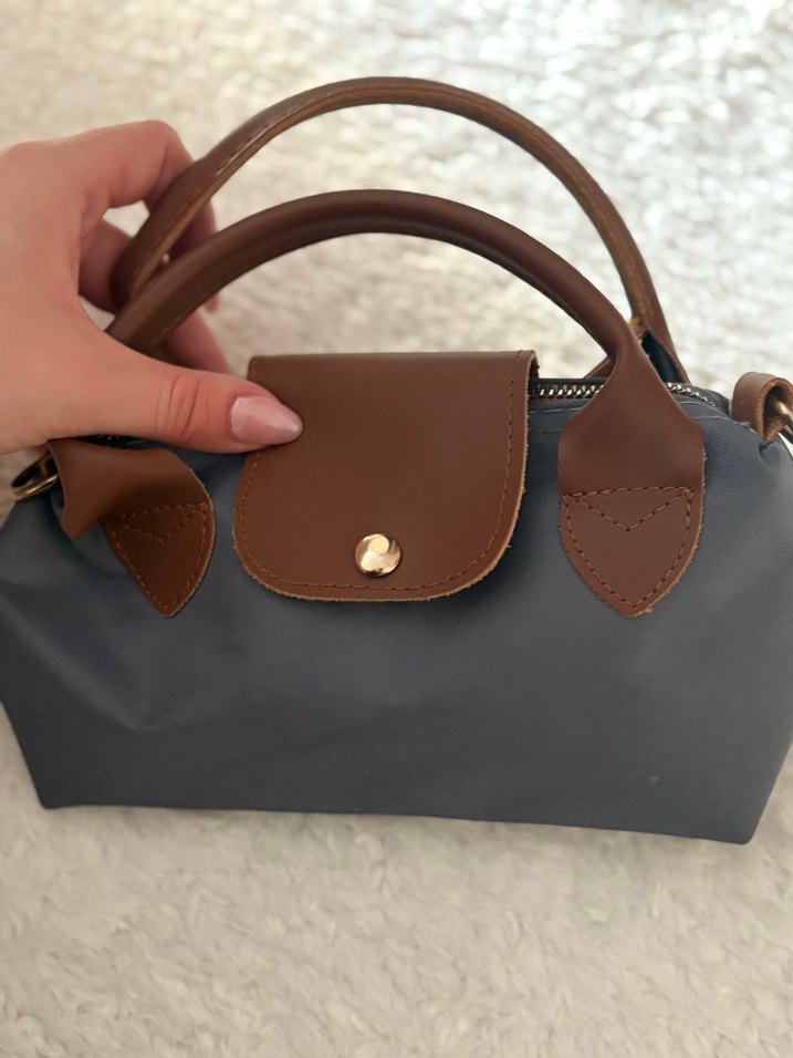 Kahverengi deri tokalı, mavi tonlarında baskılı kadın el çantası, günlük kullanıma uygun modern tarzda. Uzun askısı da mevcuttur.