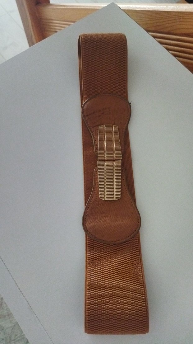 Parlak kahverengi deri malzemeden yapılmış, tokalı ve vintage bohem tarzını yansıtan lastikli kadın kemeri.