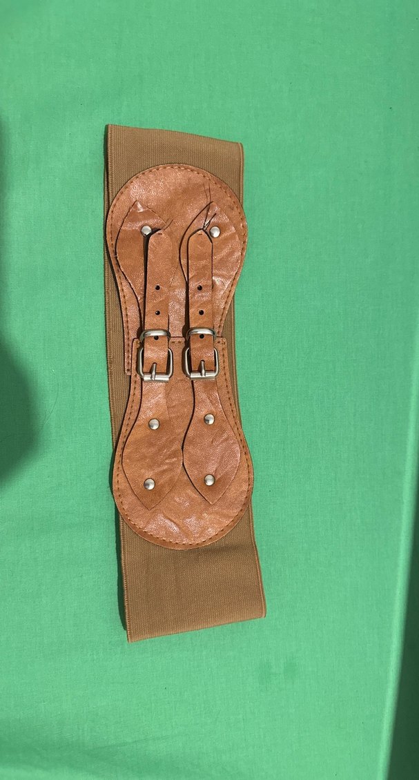 Kahverengi deri çift tokalı ve esnek kumaş bantlı kadın kemeri, vintage ve karşı kültür tarzını yansıtıyor.