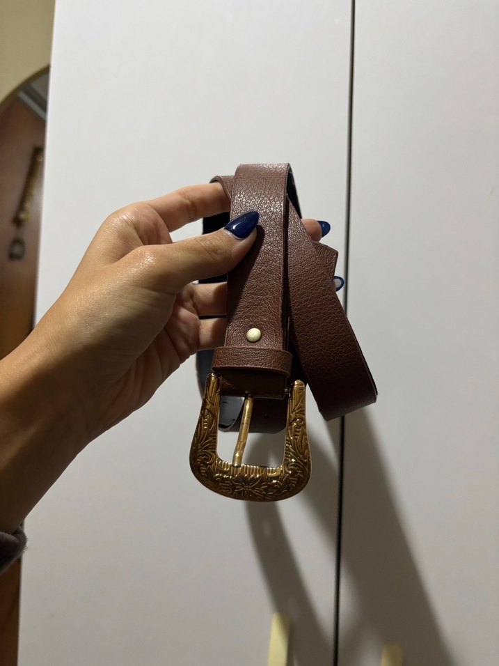 Koyu kahverengi deri kadın kemeri, detaylı altın renk tokasıyla trendy ve bohem tarzlara uygundur.