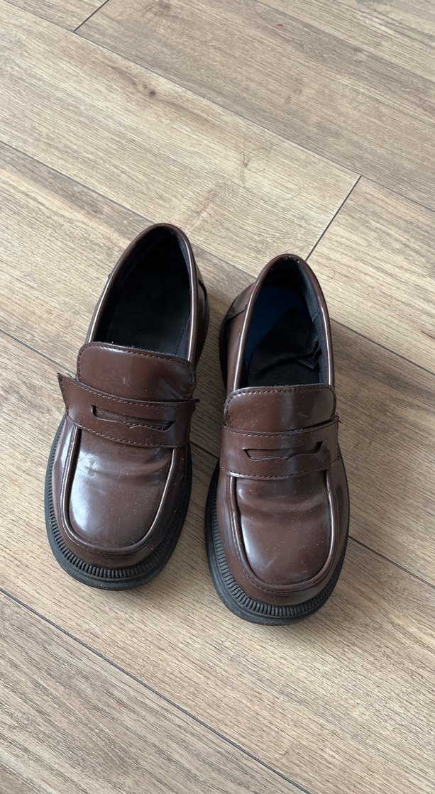 Kahverengi deri tokalı kadın loafer, platform topuklu, günlük sokak stiline uygun klasik ve sade tasarım. Desensiz ve koyu renklidir.