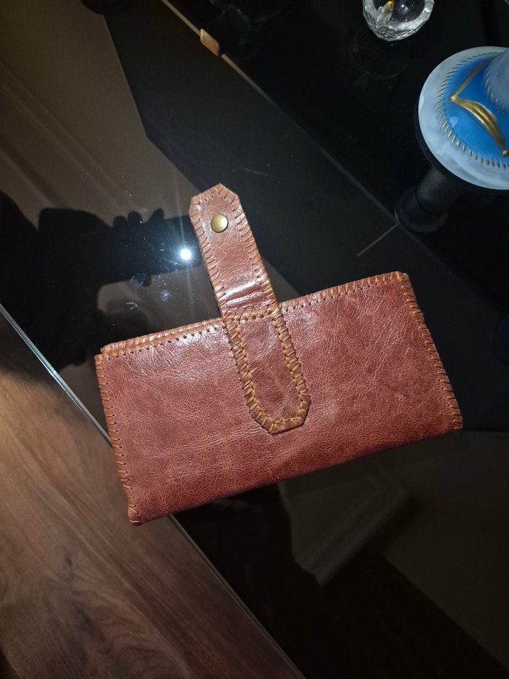 Parlak kahverengi deri tokalı kadın portföy cüzdan, sade ve vintage esintili bohem tarzıyla günlük kullanıma uygundur.