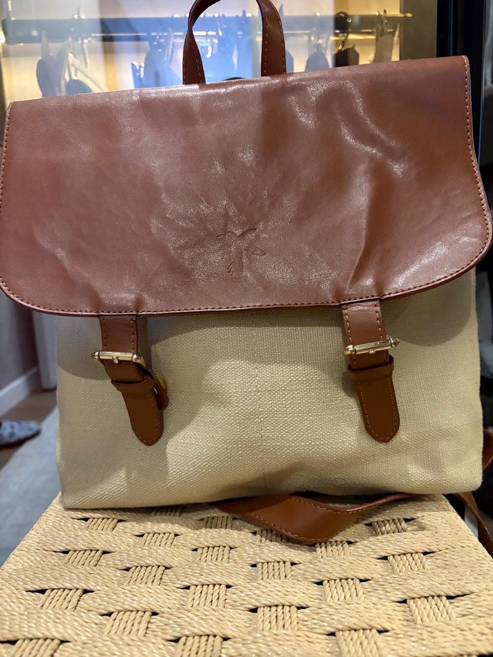 Parlak kahverengi deri kapak ve tokalı detaylara sahip, baskılı bej gövdesiyle bohem tarzı yansıtan kadın sırt çantası. Günlük kullanıma uygundur.