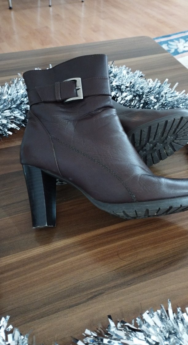 Kahverengi deri, tokalı ve blok topuklu kadın botu, günlük kullanım için uygun, desen içermeyen şık tasarım.Resimde belirttim sadece topuk altı düştü yapılabilir